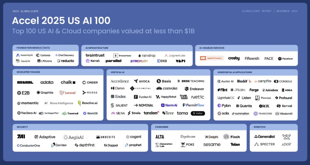 Accel’s US AI 100 highlights the companies shaping the next era of artificial intelligence across the U.S. The list is part of Accel’s broader Globalscape report, which explores the forces driving what they call a new industrial revolution.
