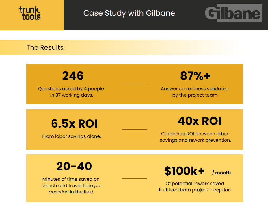 The pilot’s success prompted the company to expand TrunkText to approximately 10 additional job sites. User feedback highlighted the tool’s ability to streamline document management and expedite responses, preventing context switching and unnecessary delays. Overall, TrunkText proved to be a transformative tool, enhancing productivity and decision-making on complex construction projects.