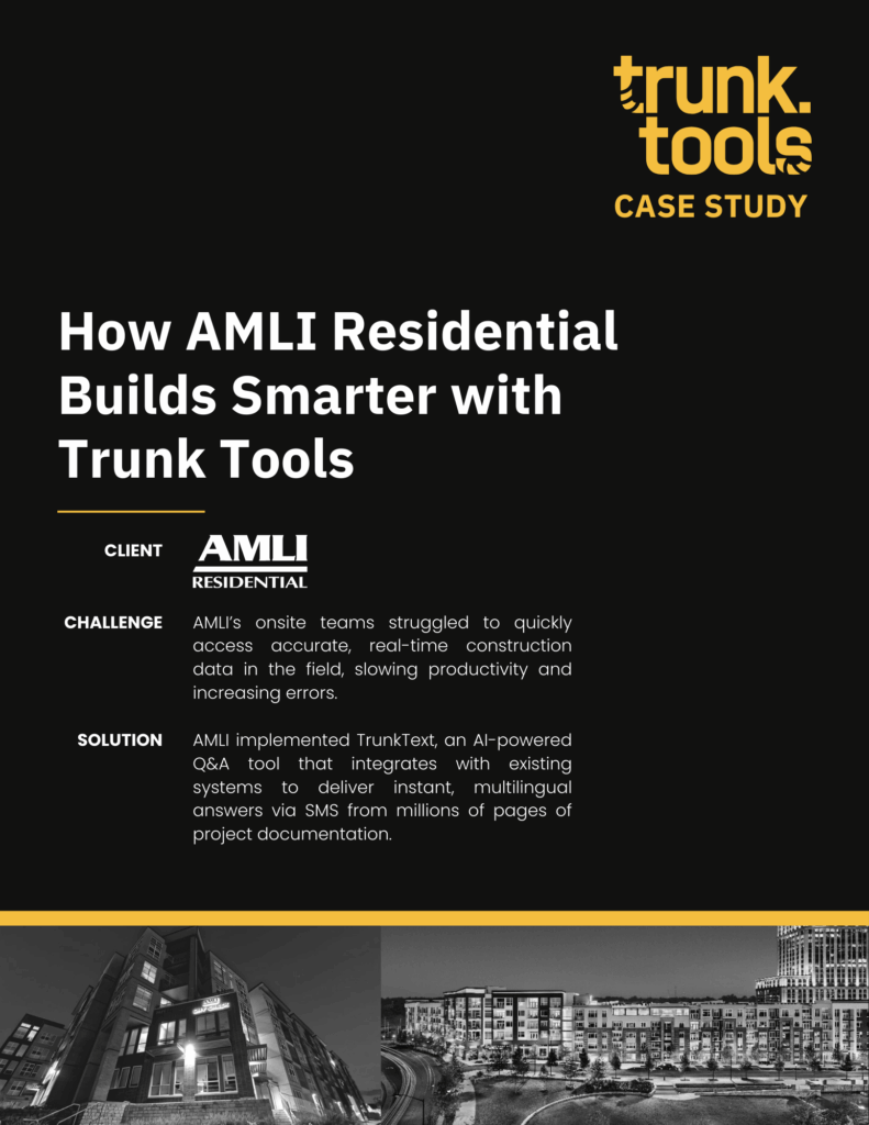 Discover how AMLI Residential harnessed Trunk Tools’ TrunkText to cut 1–2 hours of field data search time per user, slash rework, and streamline every project across their $15B portfolio.